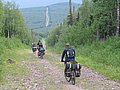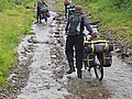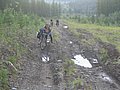 Оставшиеся 3 километра до реки Лимбекою так проехать и не удалось, т.к. тракт совсем раскис и слой глины покрывал покрышки даже ведомый с боку велосипед, не говоря уже с туристом в седле. Глину приходилось постоянно счищать, велосипеды становилось все труднее и труднее везти. Путь длиной 1-2 км представляет собой несколько глубоких колей вездеходов в вязкой и мокрой глине. Можно или катить с остановками или нести велосипед. 1 км/час – такова наша скорость на этом участке.