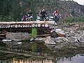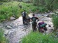 Перед одним из бродов, на каменистом участке у Сергея Гавенко лопается нижняя часть стойки багажника. Серега дотягивает вел до брода, Алексей помогает с рюкзаком. Алексей с Андреем готовят обед, в то же время оба Сергея чинят багажник.