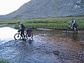 Выехав на тракт, наши велосипеды впервые за несколько последних дней набирают среднюю скорость свыше 10 км/час. Дорога пересекается многочисленными ручьями, но их пересечение совсем не означает попадание в болото, а лишь небольшой обнос по камням, а некоторые вообще удается проскочить в седле.